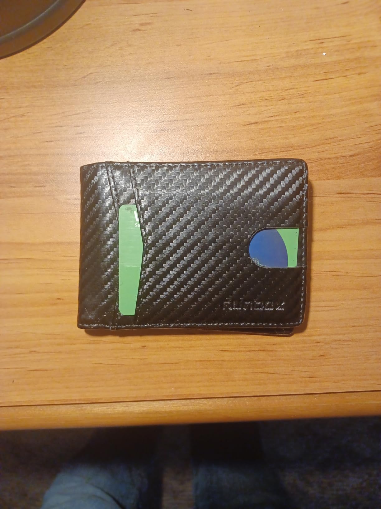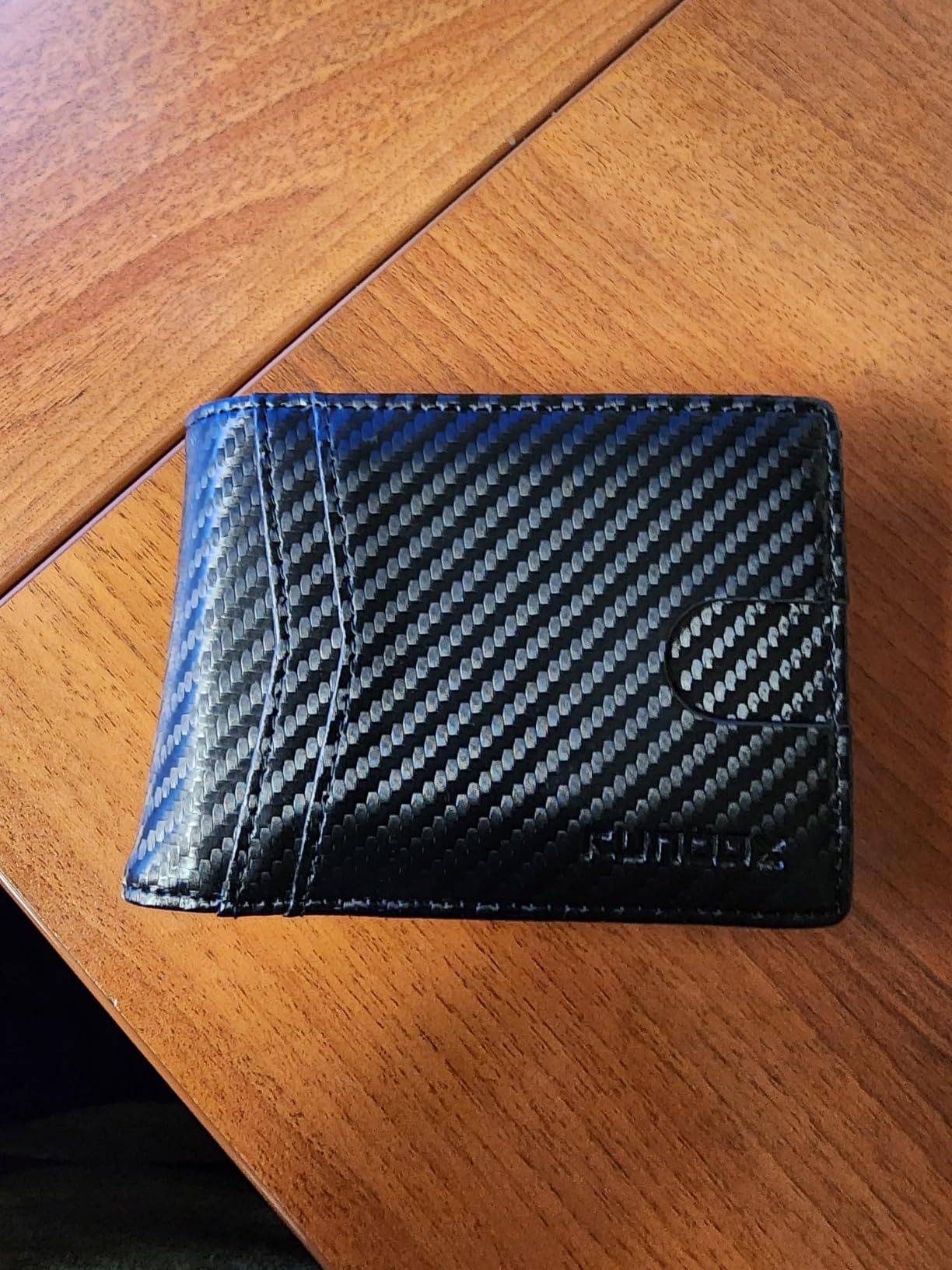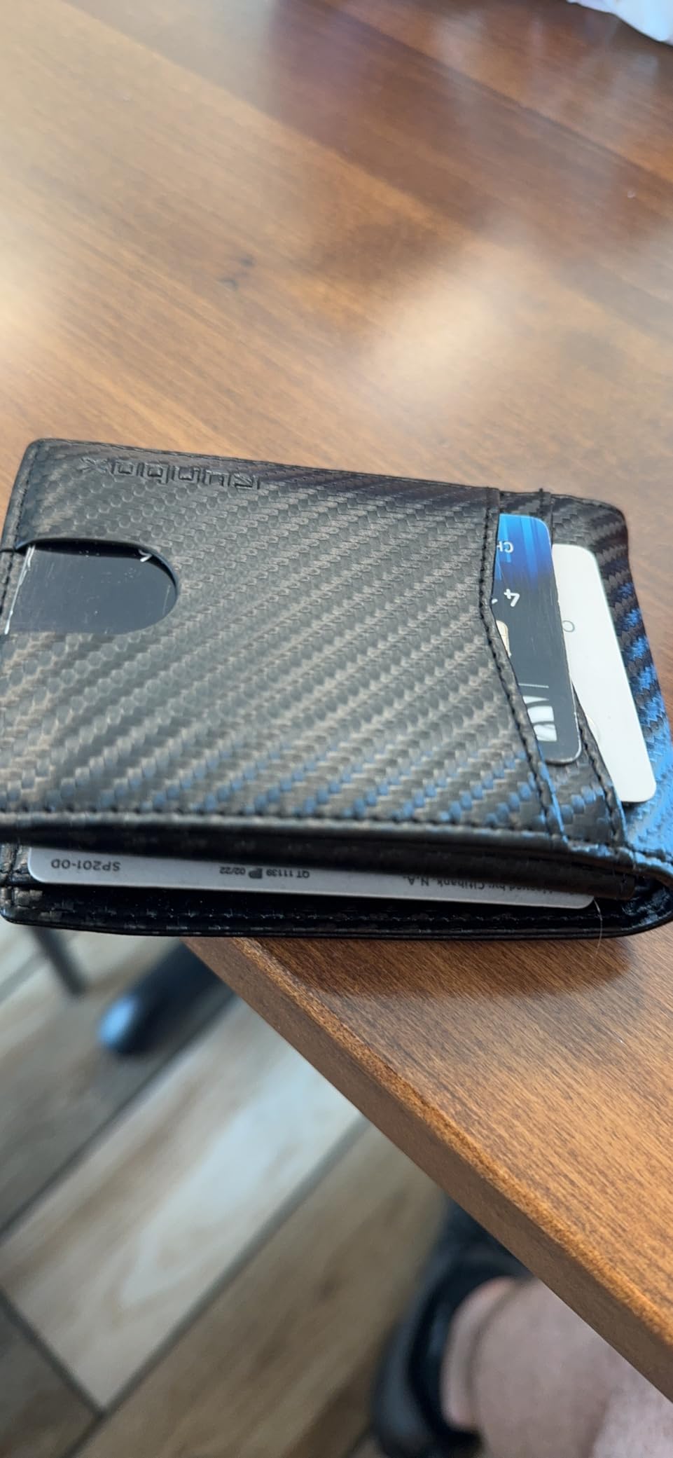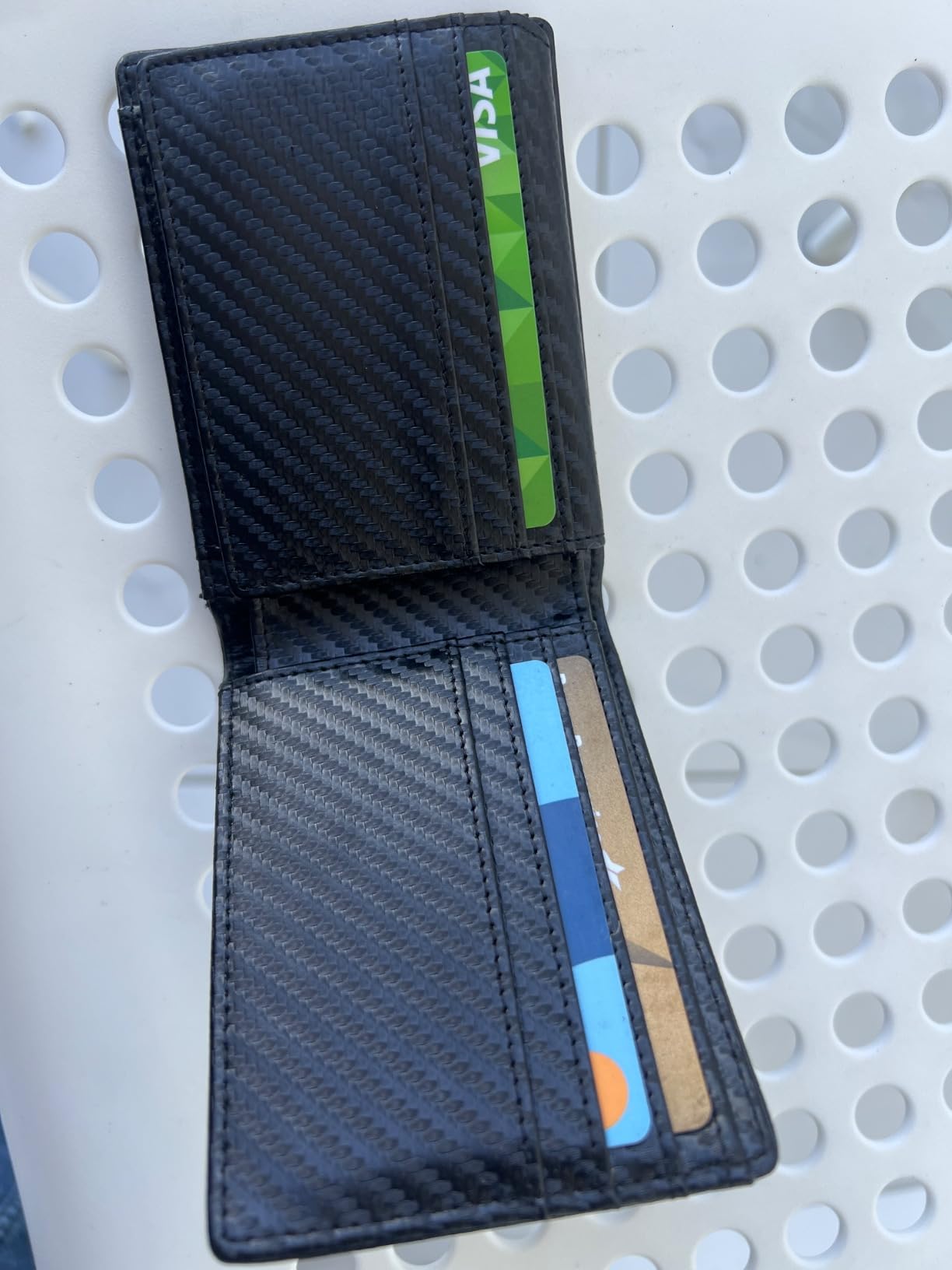 Update: I liked mine so much, I got one for my son because he thinks someone got his cards number from his wallet. Love the carbon fiber look on the leather. Very clean modern looking. It's lightweight and very versatile with lots of storage for business cards and credit cards. Security is a nice feature nowadays that my old wallet didn't have. It's got two nice spots for your driver's license and a photo on the other side.