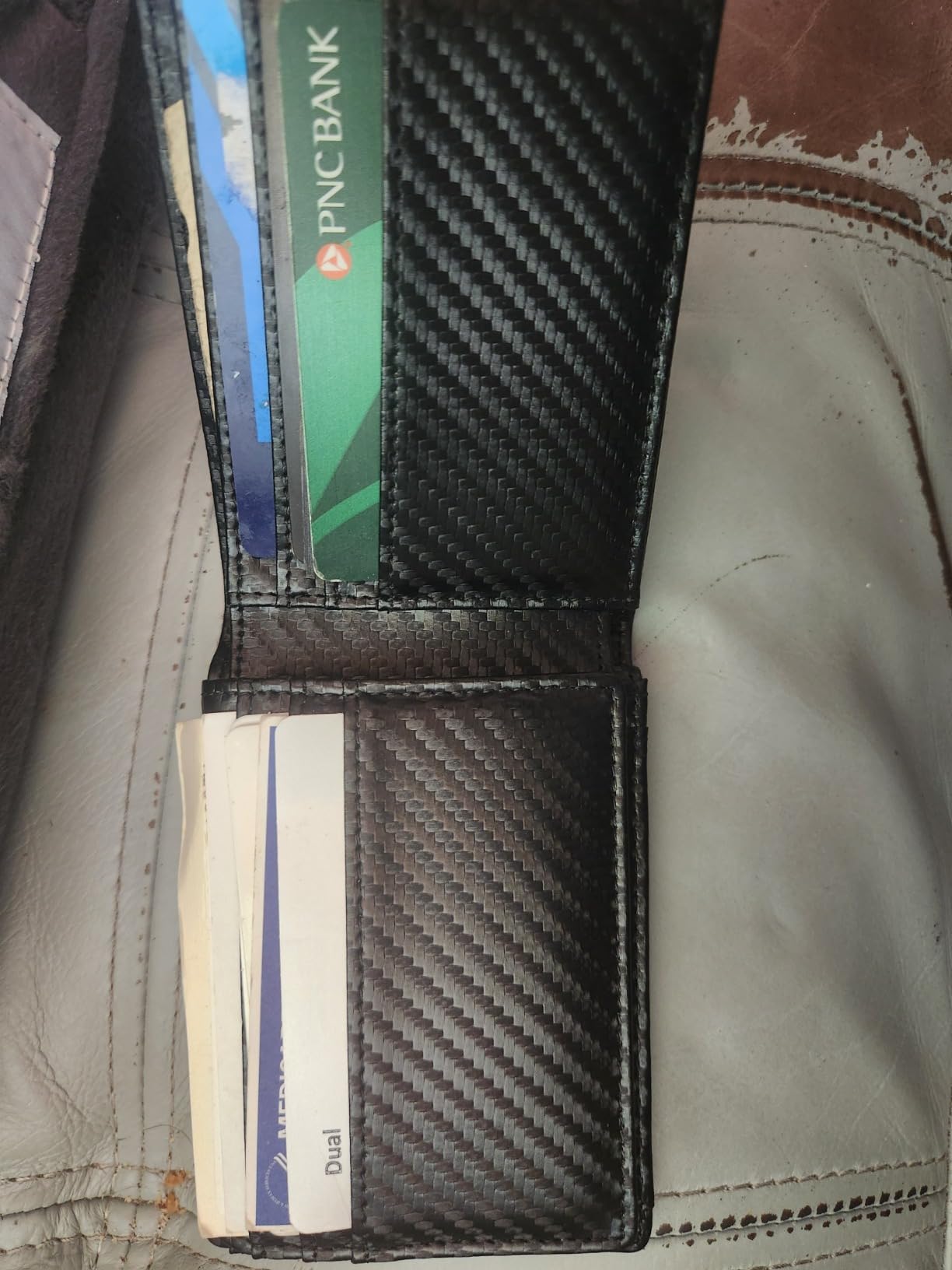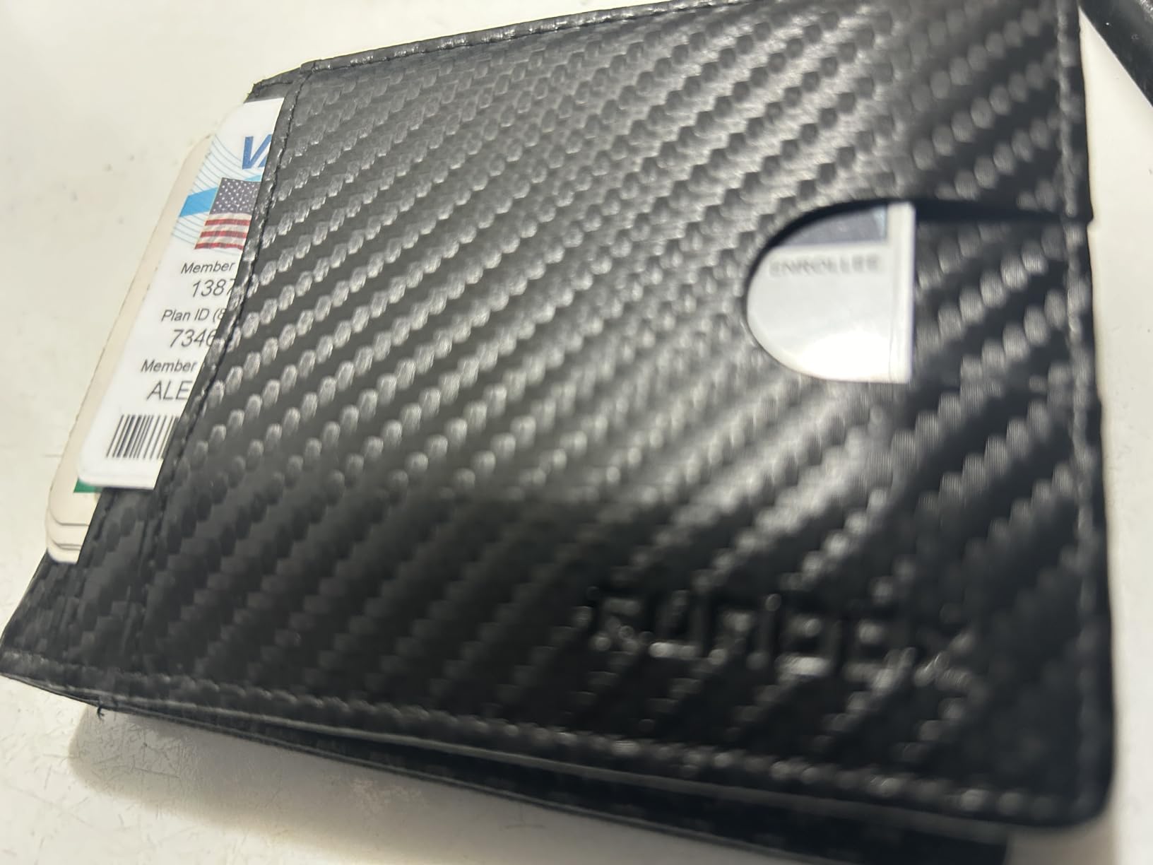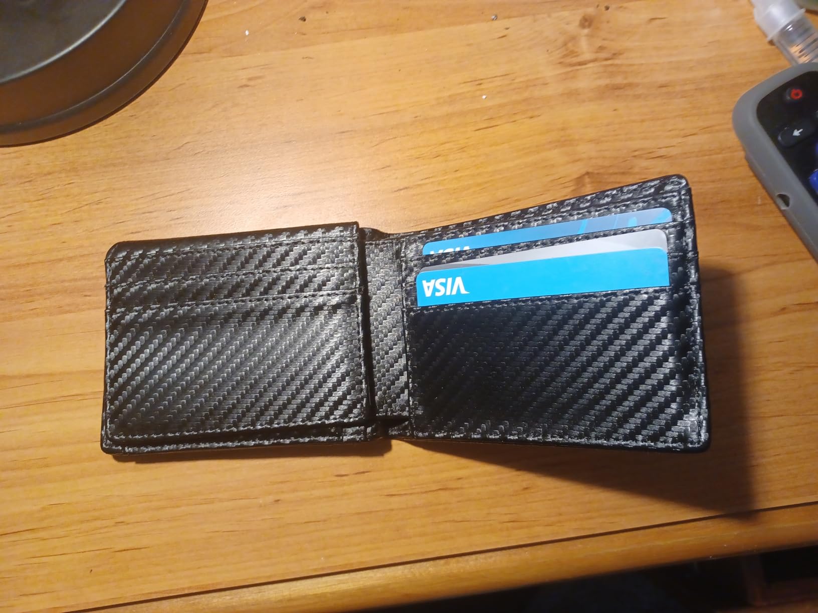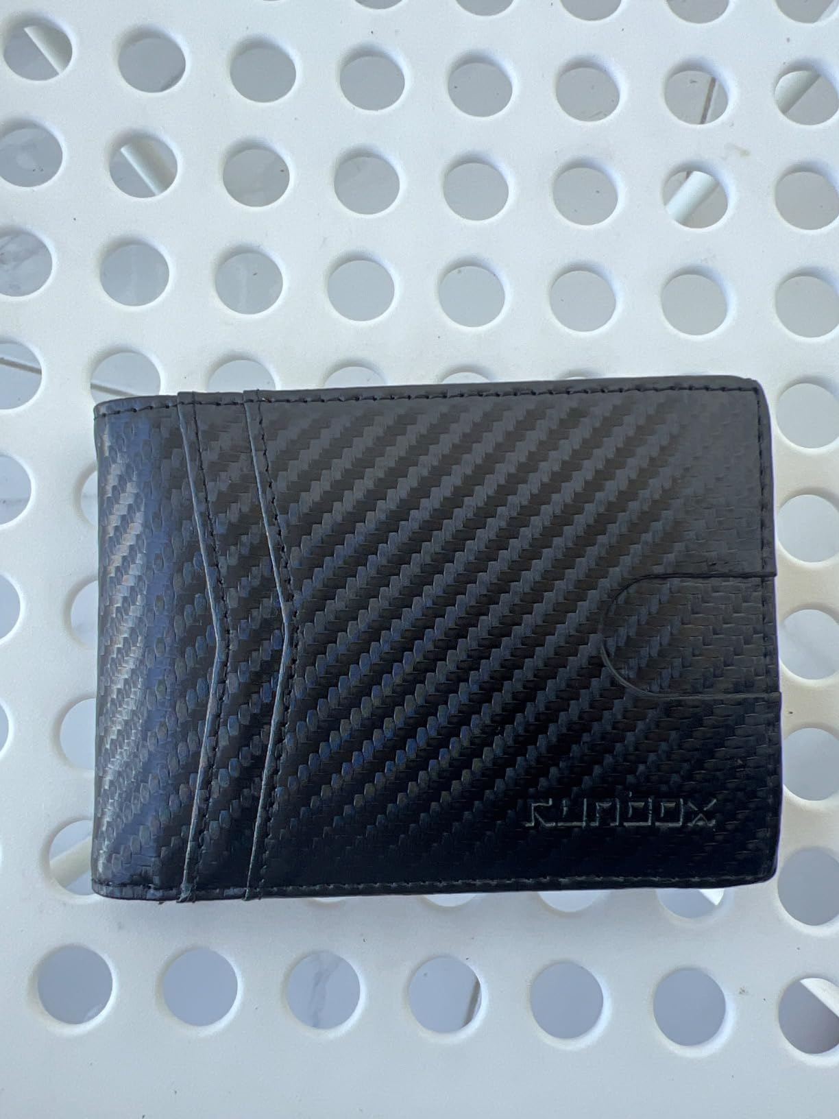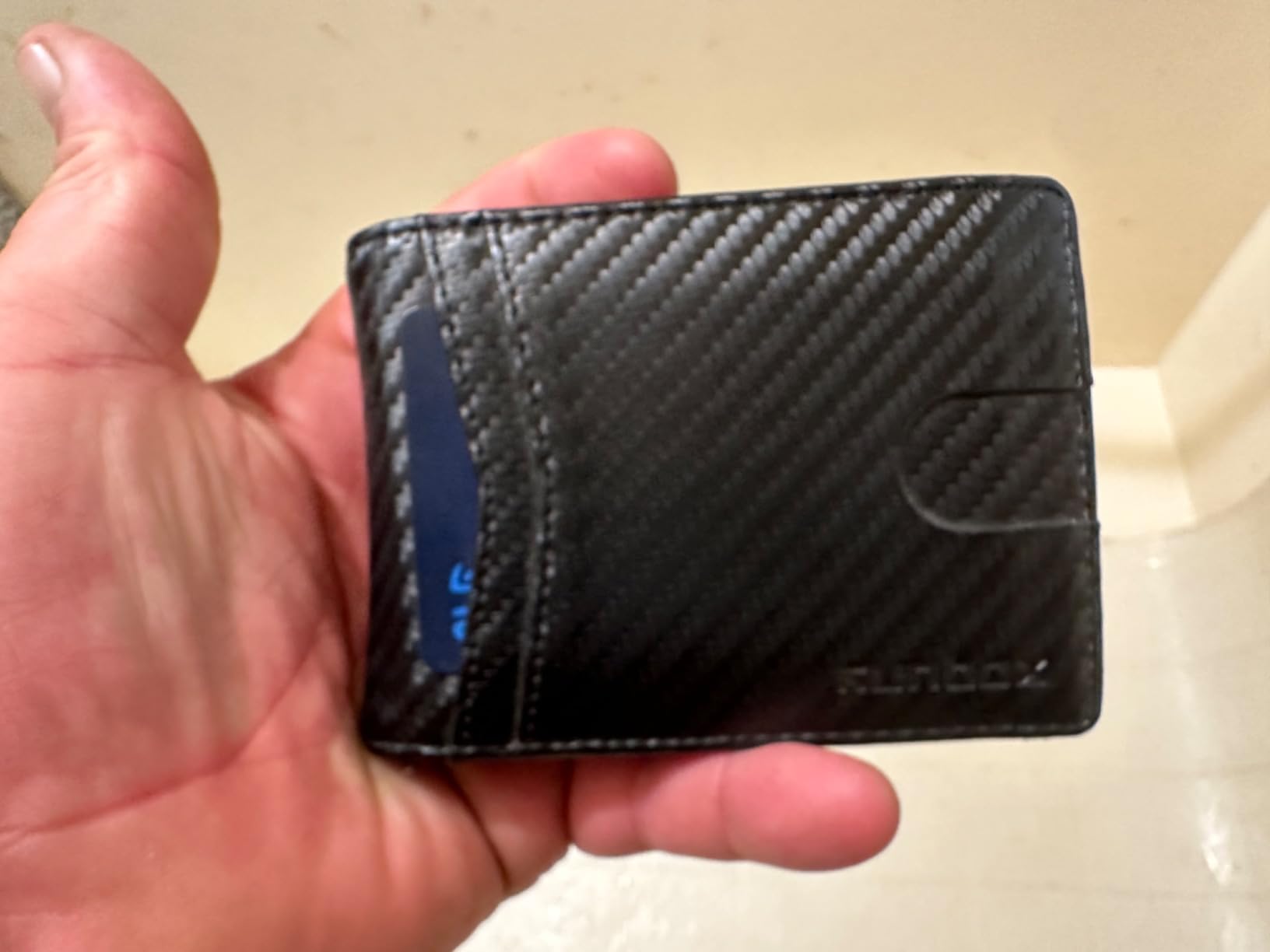 Update: I liked mine so much, I got one for my son because he thinks someone got his cards number from his wallet. Love the carbon fiber look on the leather. Very clean modern looking. It's lightweight and very versatile with lots of storage for business cards and credit cards. Security is a nice feature nowadays that my old wallet didn't have. It's got two nice spots for your driver's license and a photo on the other side.