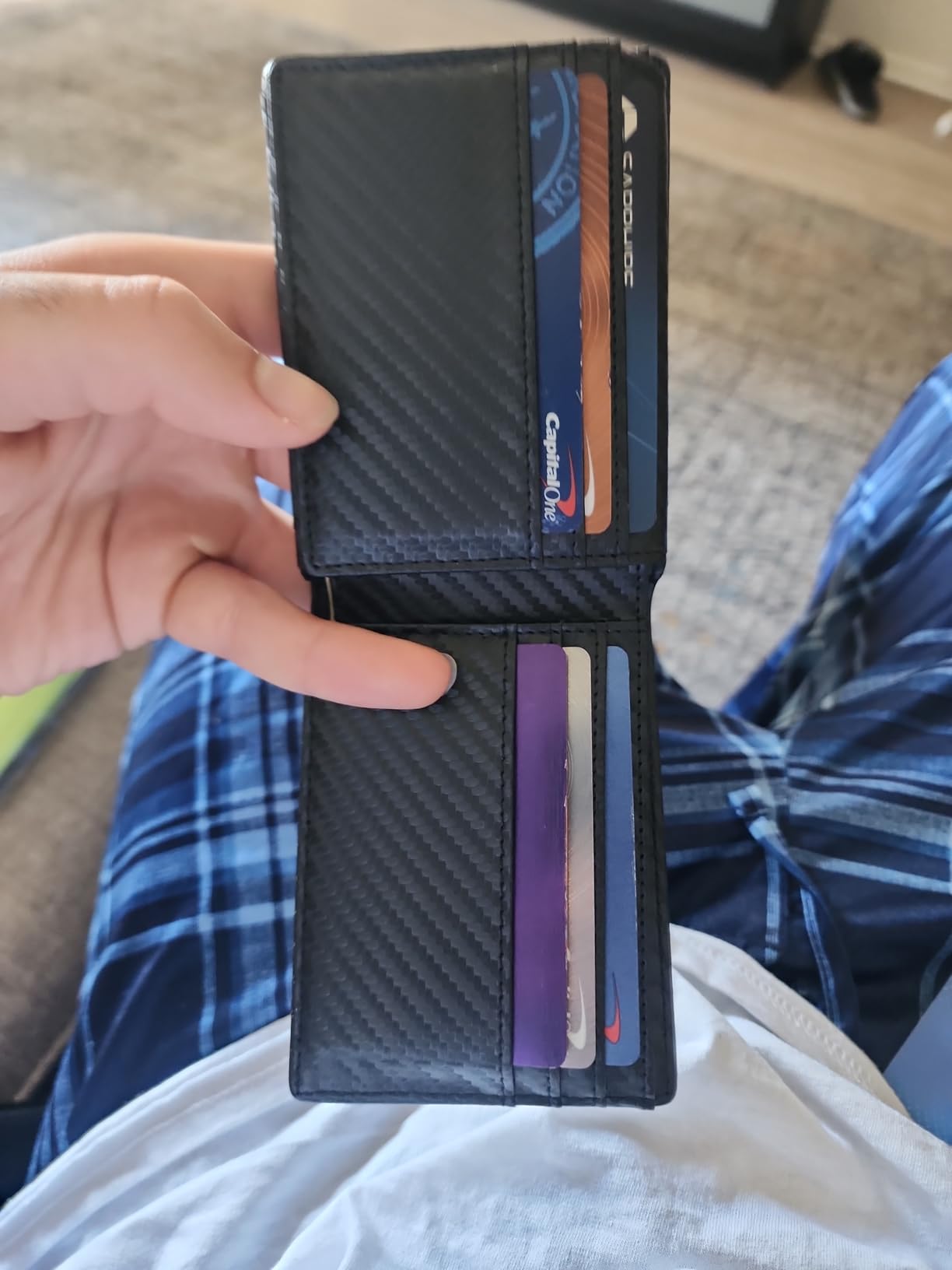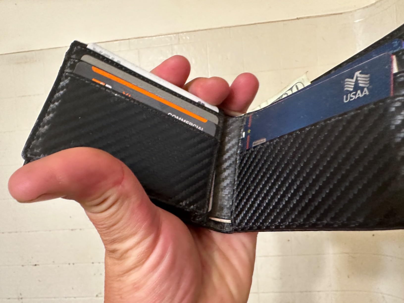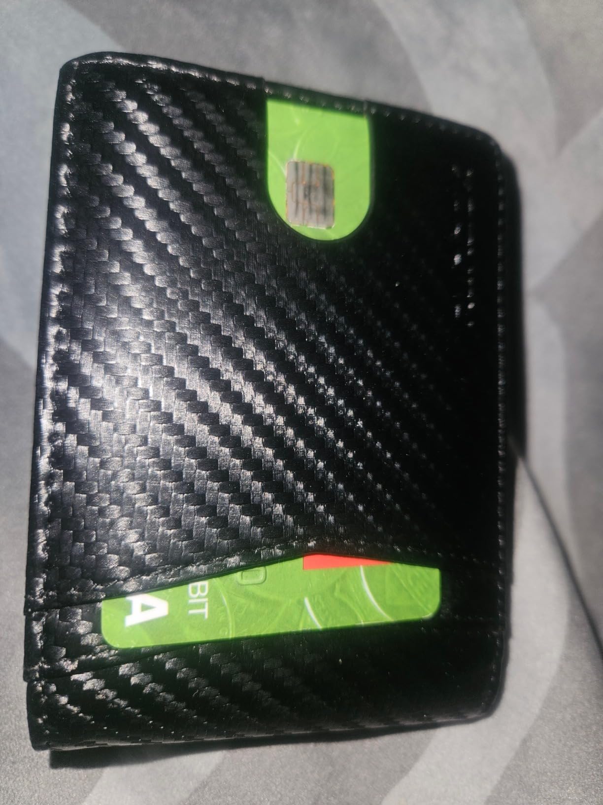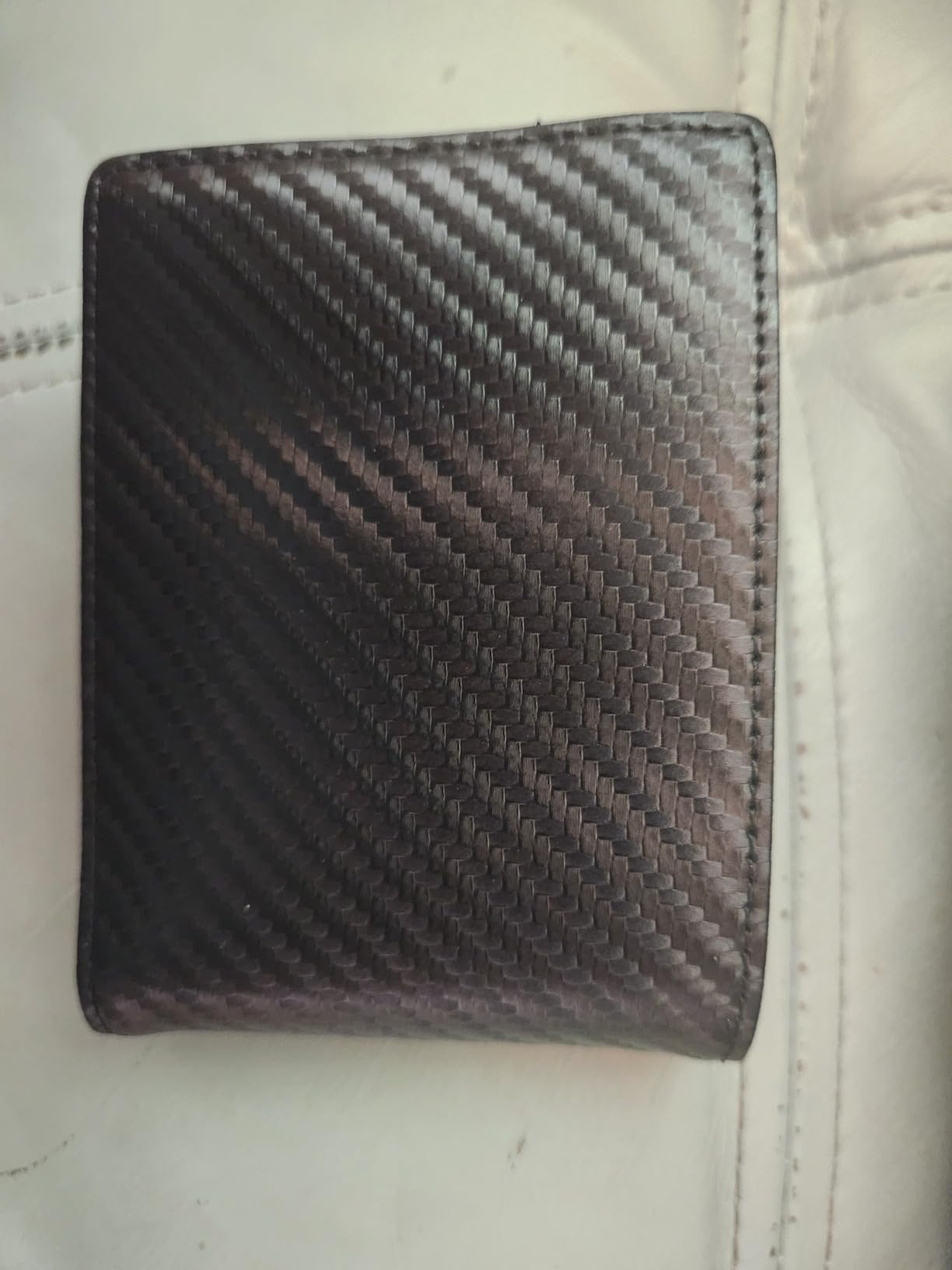 Update: I liked mine so much, I got one for my son because he thinks someone got his cards number from his wallet. Love the carbon fiber look on the leather. Very clean modern looking. It's lightweight and very versatile with lots of storage for business cards and credit cards. Security is a nice feature nowadays that my old wallet didn't have. It's got two nice spots for your driver's license and a photo on the other side.