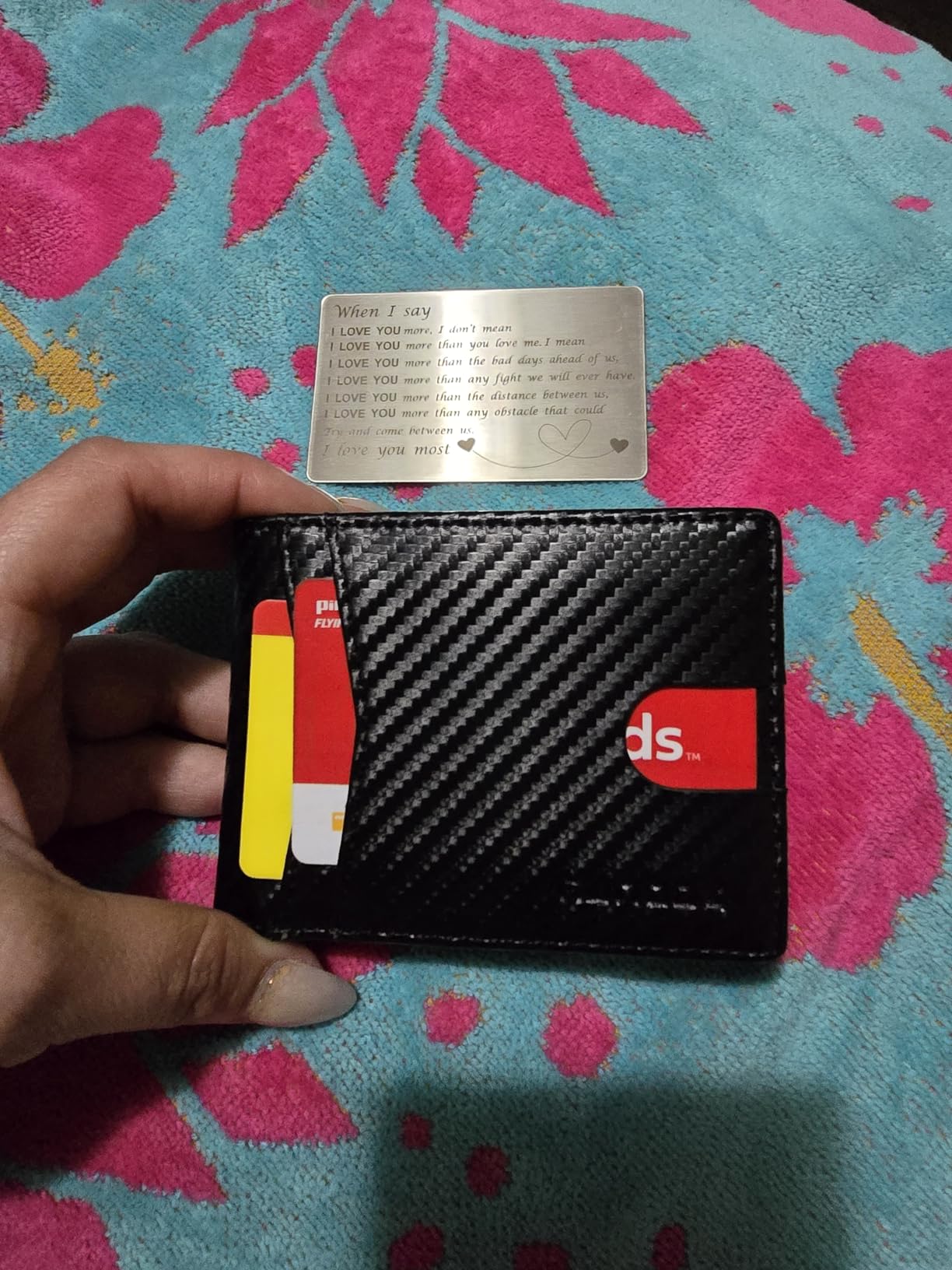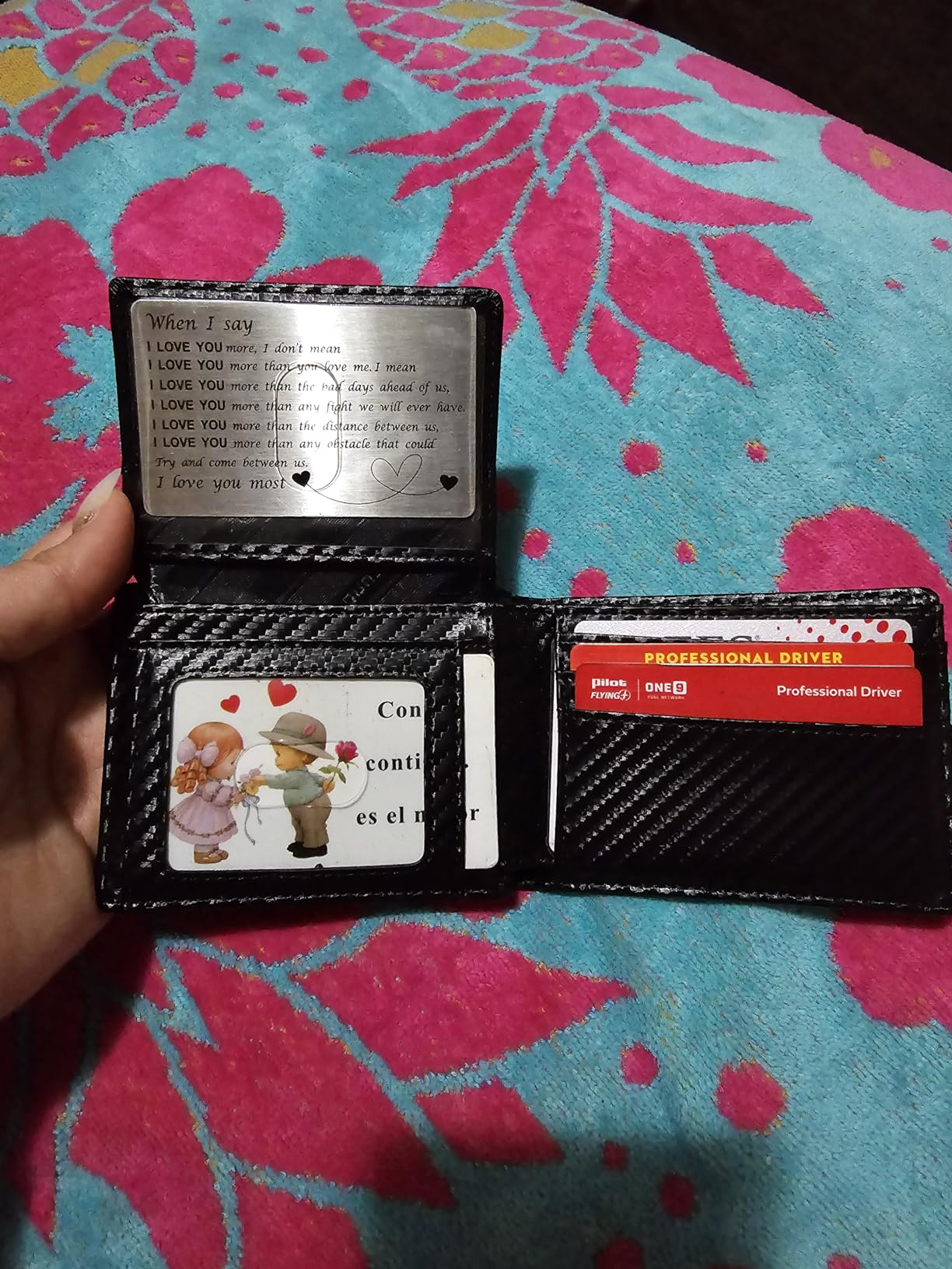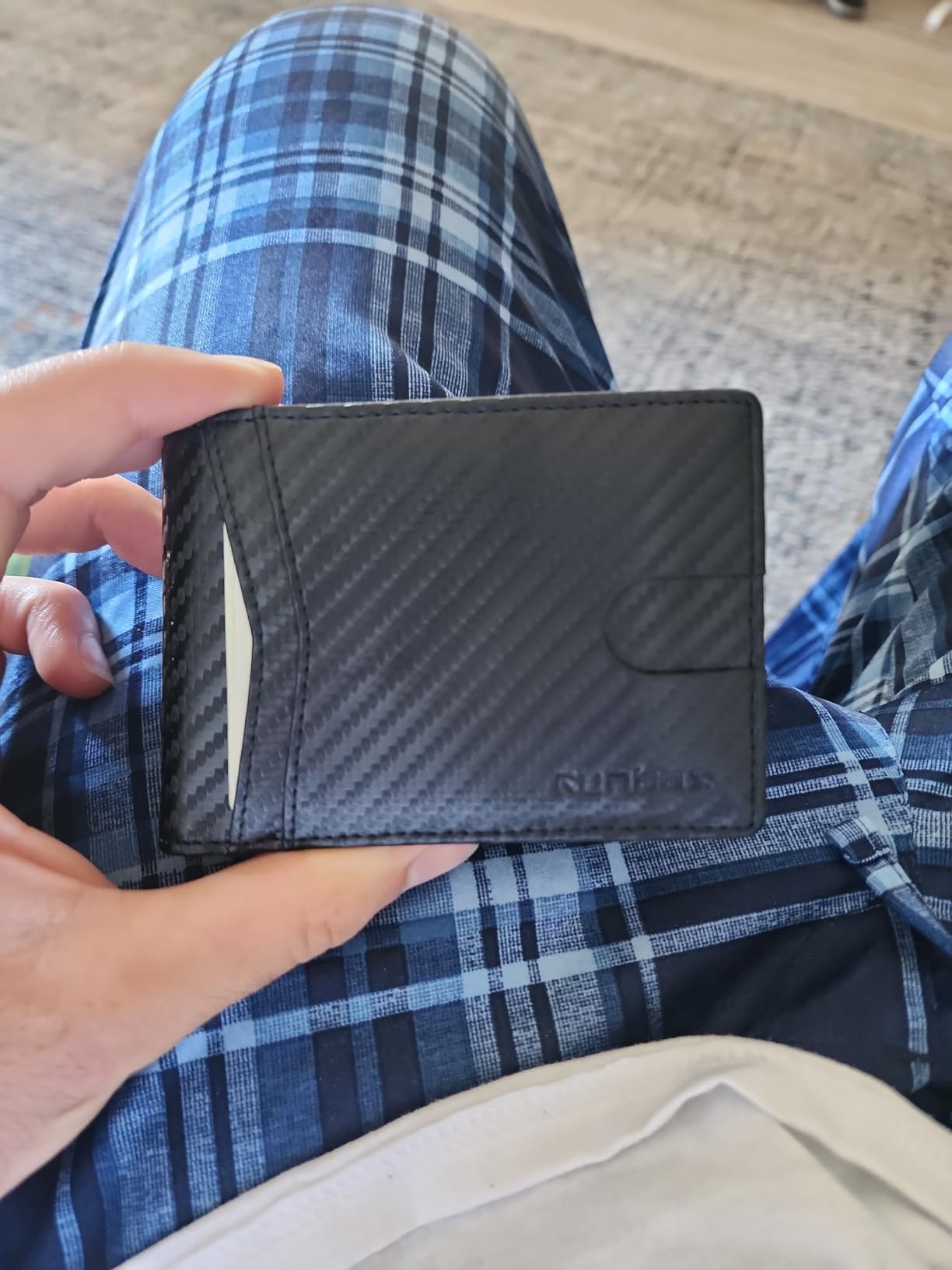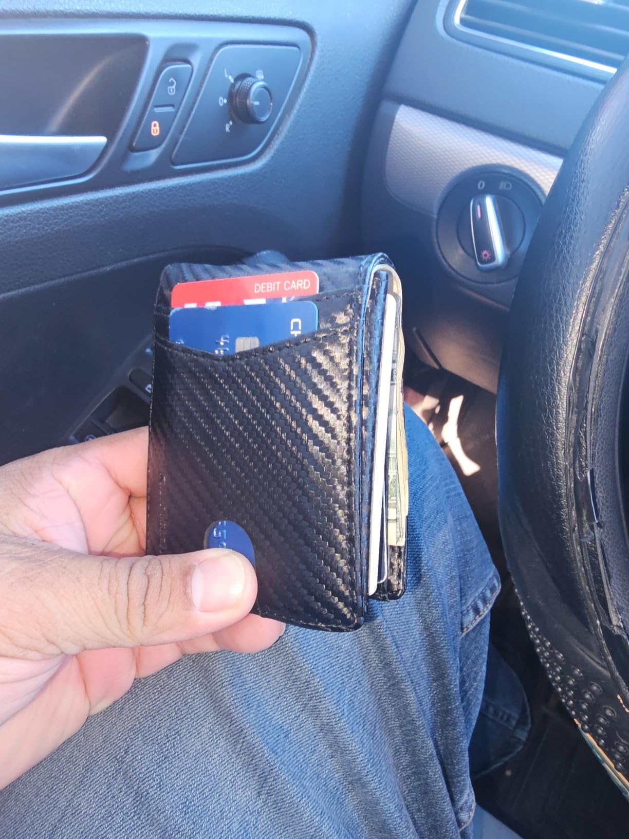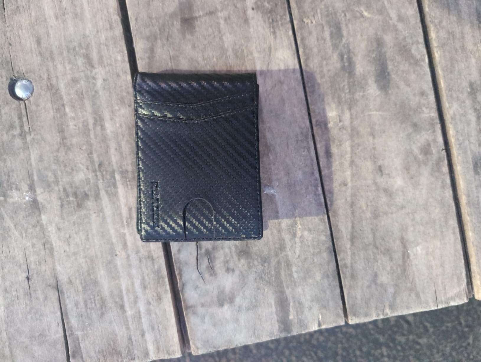 Update: I liked mine so much, I got one for my son because he thinks someone got his cards number from his wallet. Love the carbon fiber look on the leather. Very clean modern looking. It's lightweight and very versatile with lots of storage for business cards and credit cards. Security is a nice feature nowadays that my old wallet didn't have. It's got two nice spots for your driver's license and a photo on the other side.