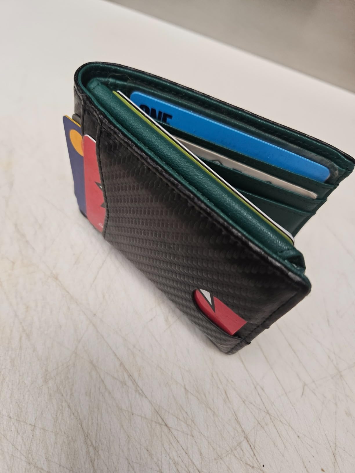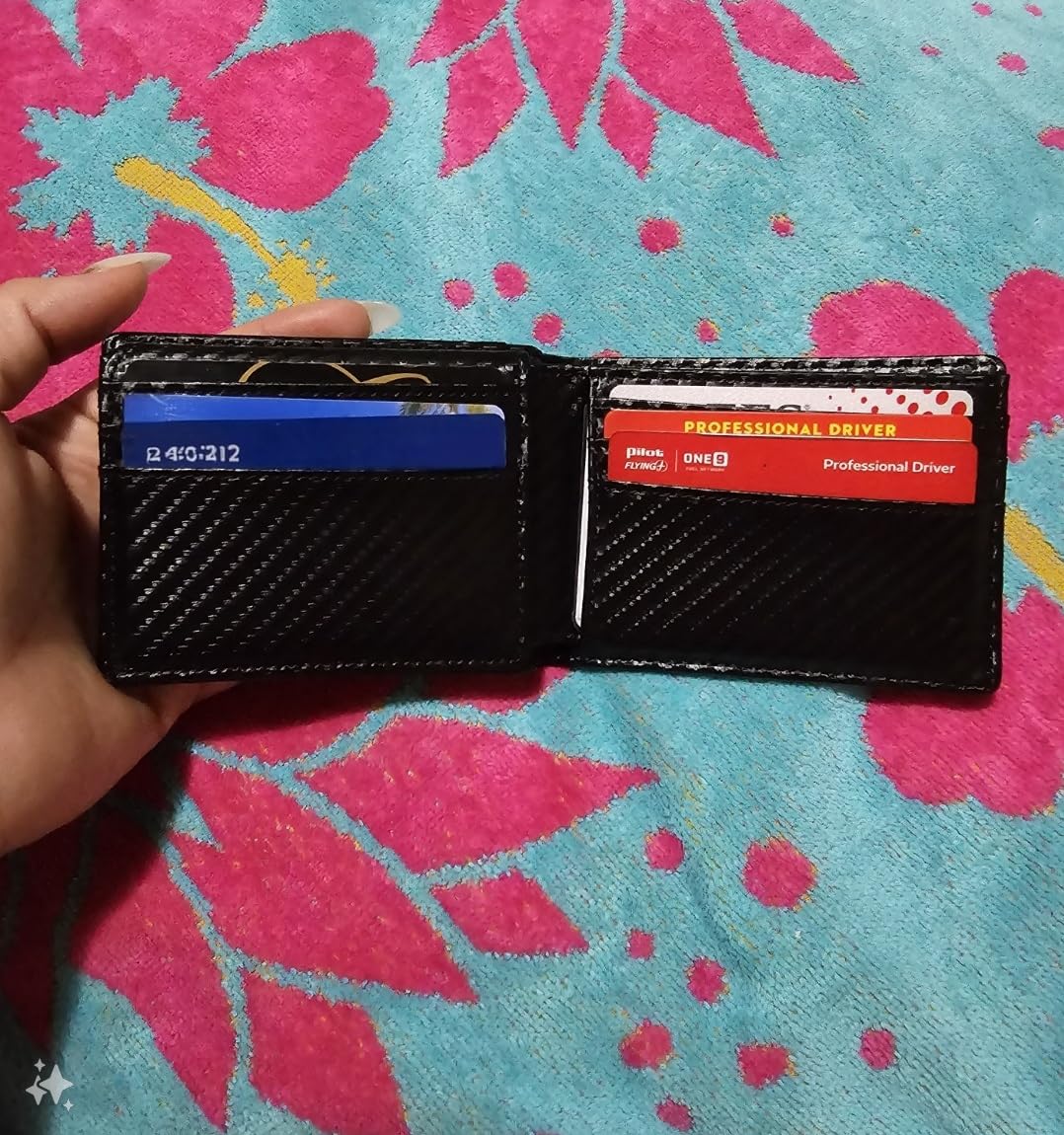 Was almost disappointed at first when I opened the box because I thought it would not fit all my cards. But soon I discovered that many pockets were hidden on the sides and hard to see at first. Very happy with this wallet it holds tons of cards.