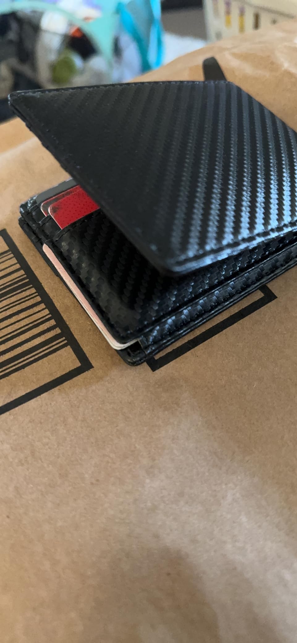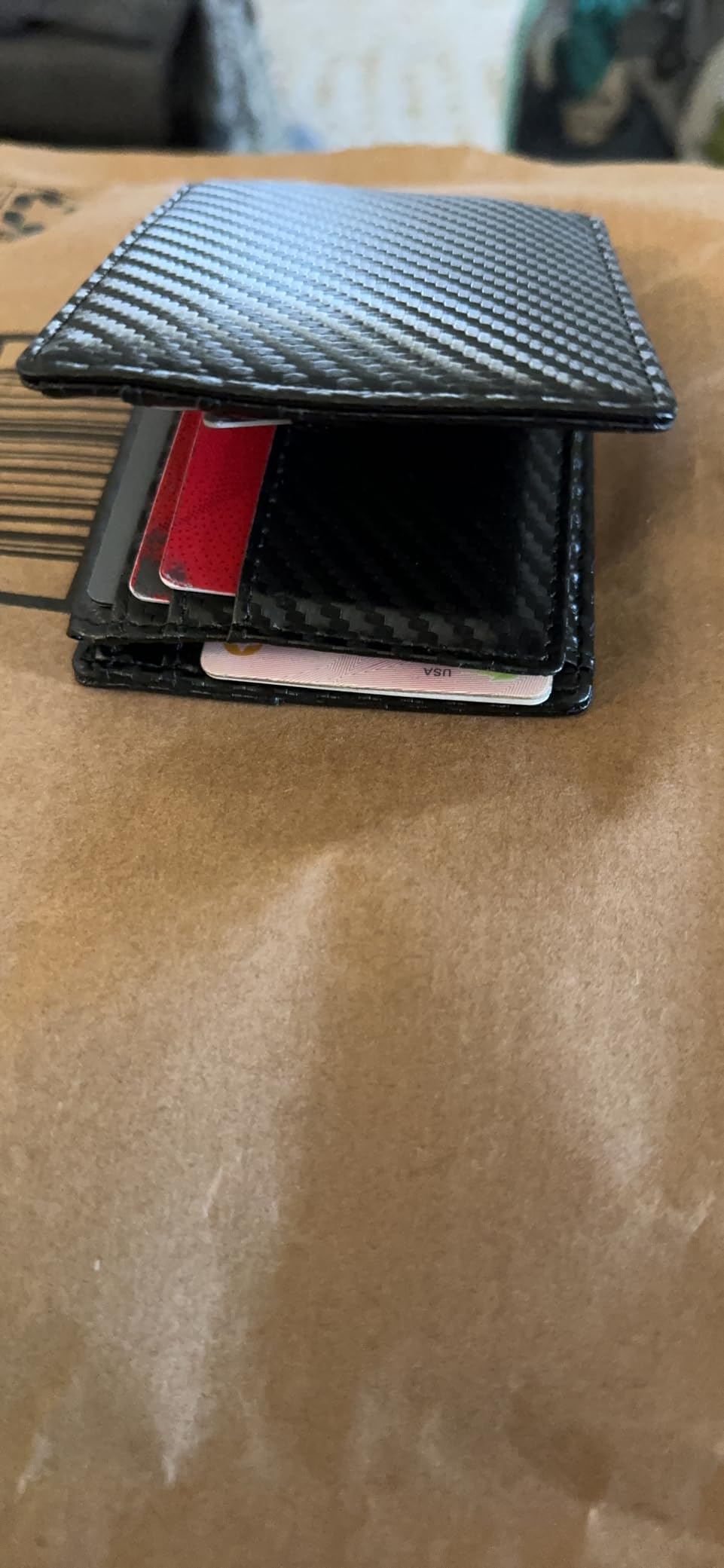 I read a lot of the reviews and the description that it is slim, but it is not really a slim wallet. The material is good, and it seems dirty, but not slim.