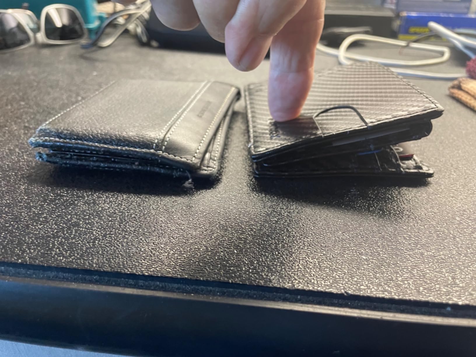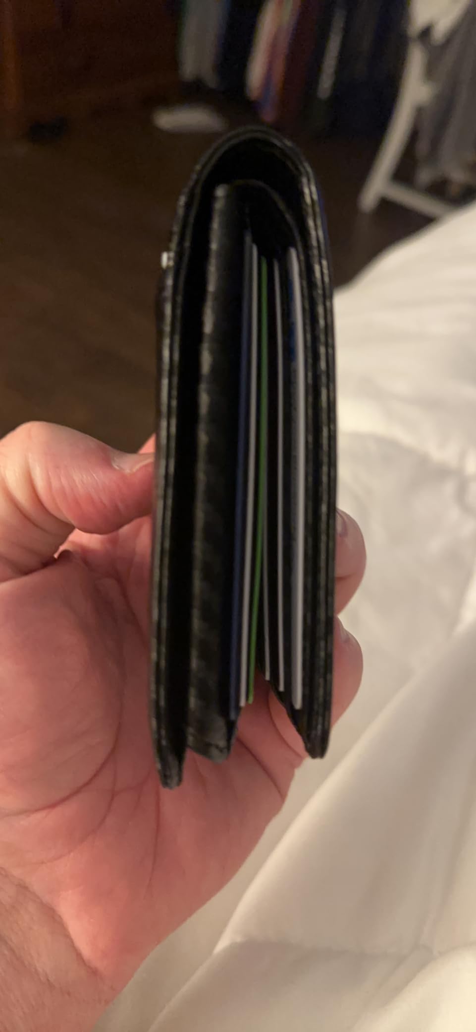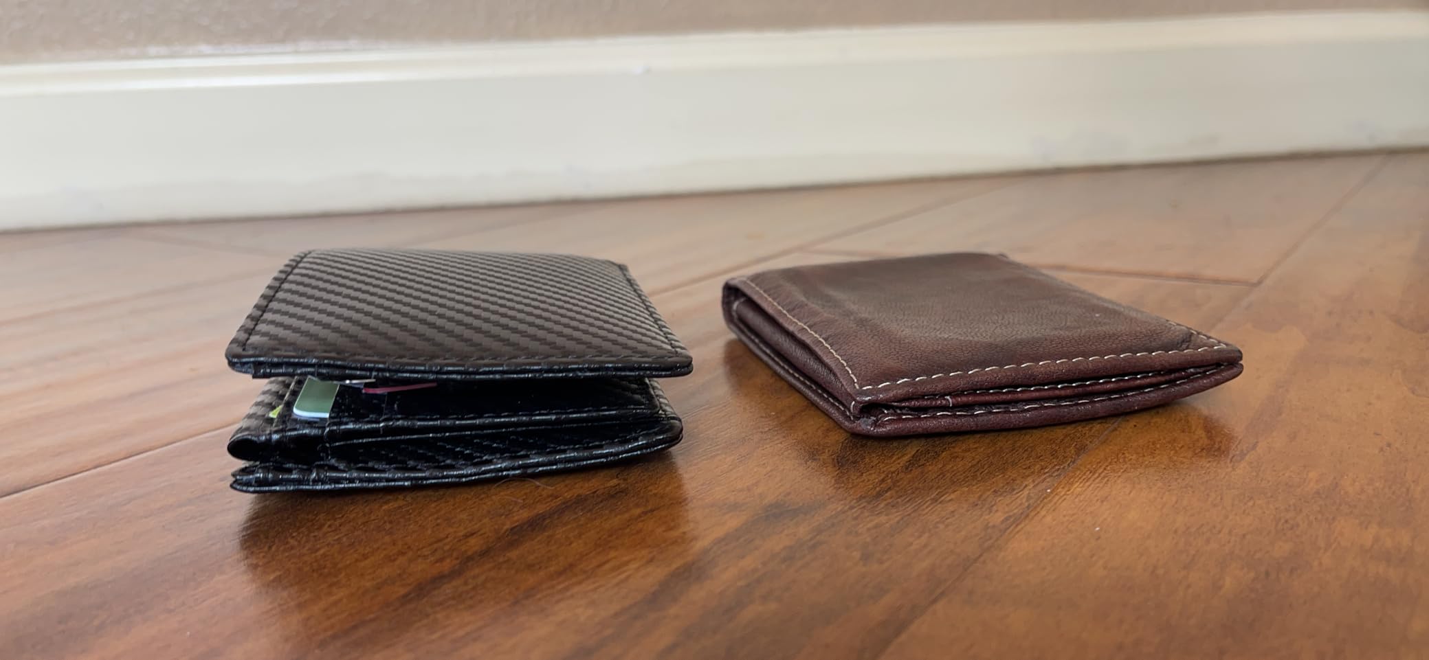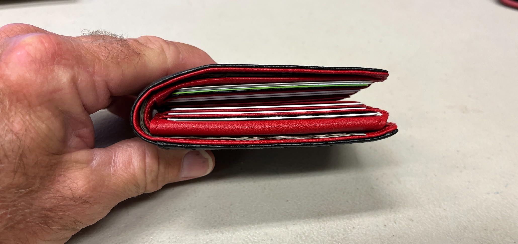 1st photo On the left side my old tired wallet. Loaded with 6 US currency bills. 8 credit cards 5 thin proof of insurance And Two ID’s. The new wallet had 1 ID 4 credit cards. The currency, and proof of insurance. The wallet loaded , by design, thick at the top see photos 2 and 3. It was not thinner by much if at all
