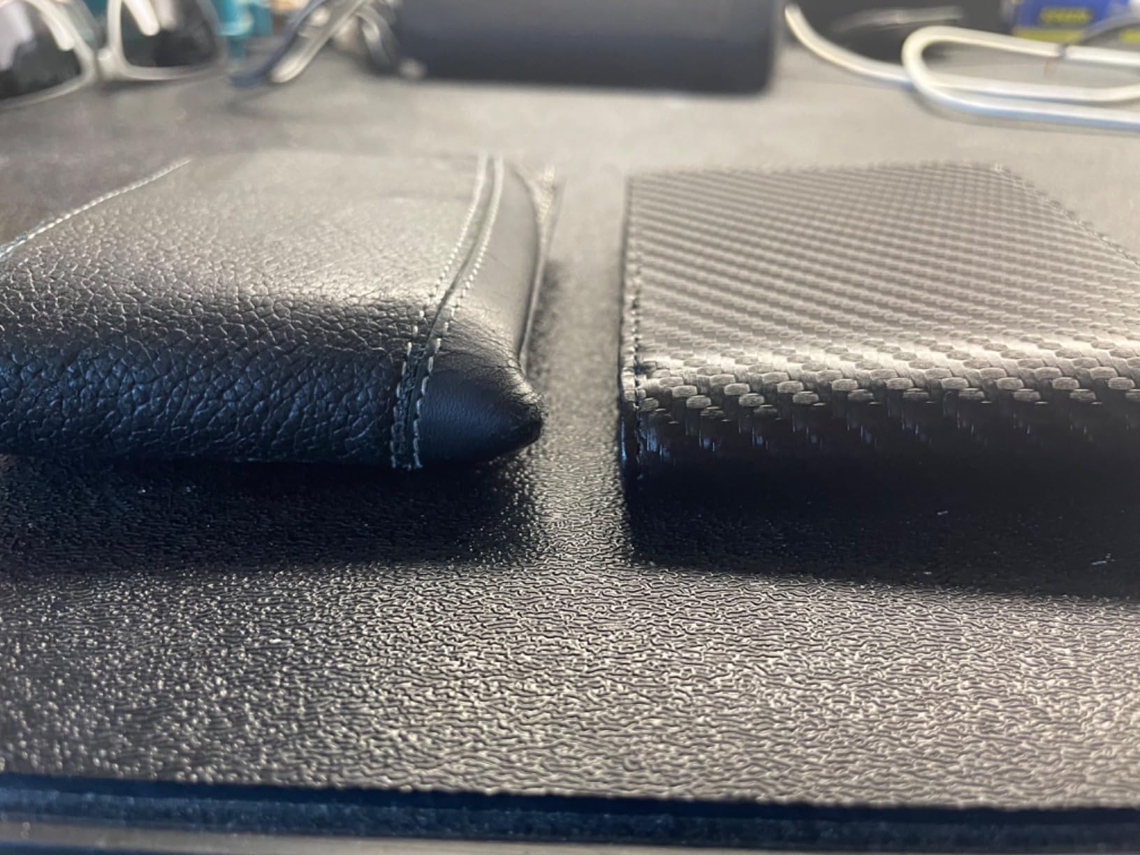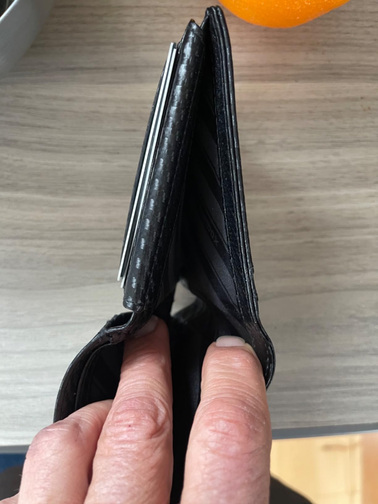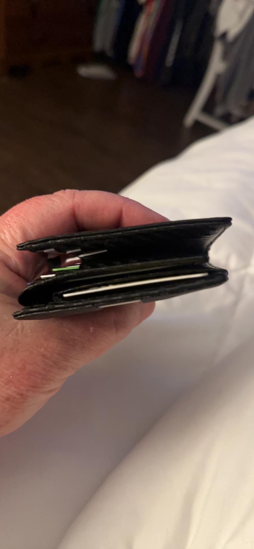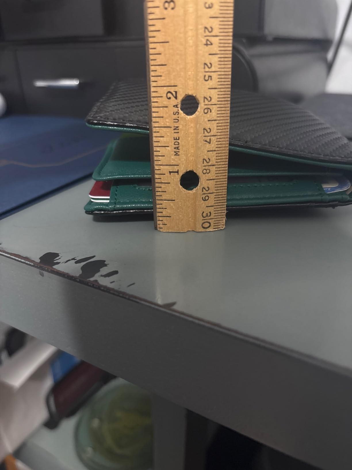 1st photo On the left side my old tired wallet. Loaded with 6 US currency bills. 8 credit cards 5 thin proof of insurance And Two ID’s. The new wallet had 1 ID 4 credit cards. The currency, and proof of insurance. The wallet loaded , by design, thick at the top see photos 2 and 3. It was not thinner by much if at all