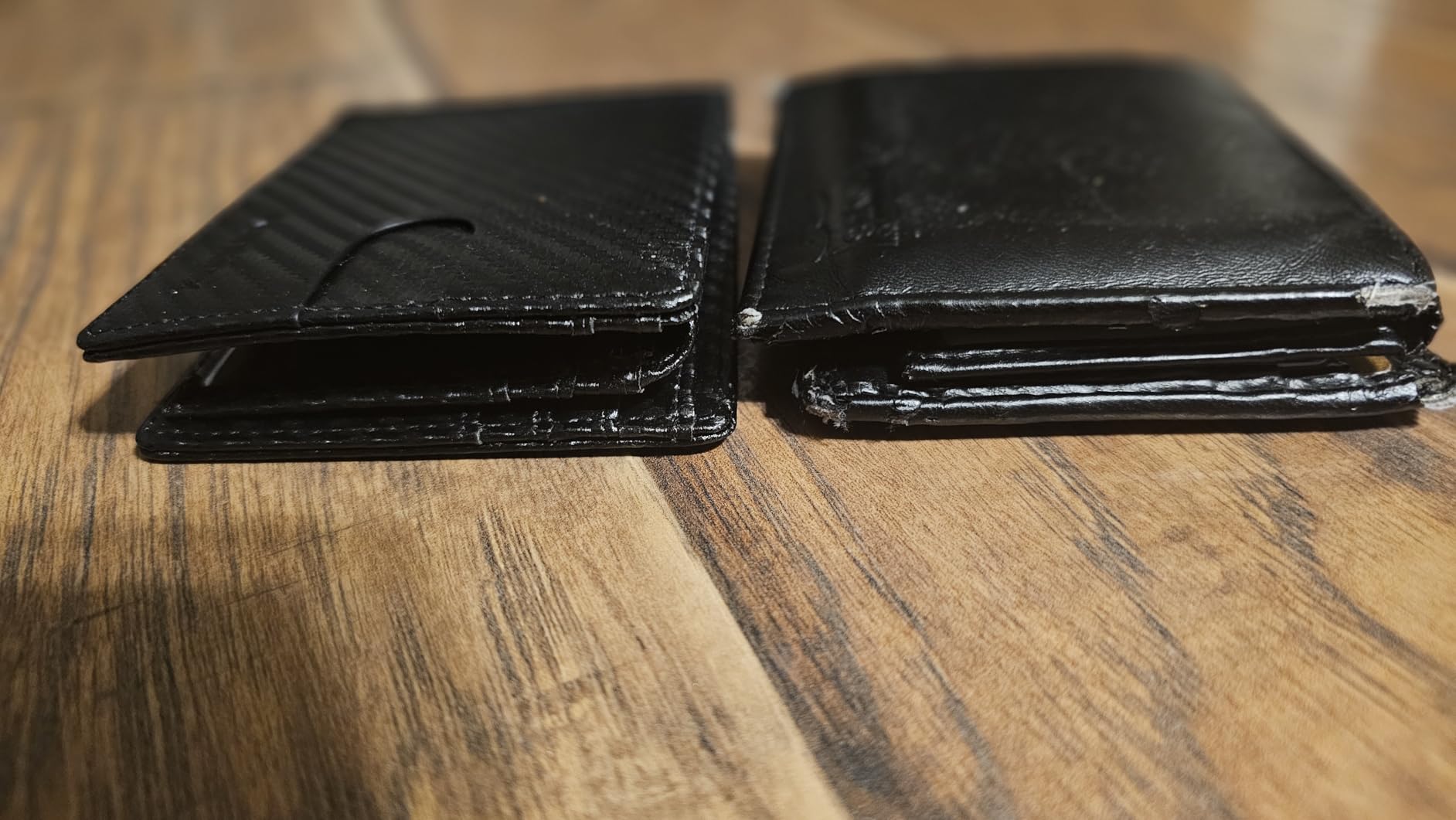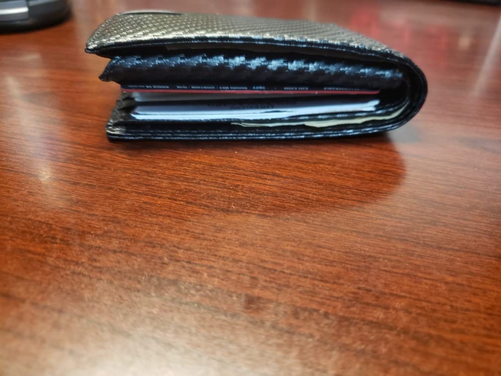 Perks: Durable, stylish, many card slots Cons: Thick, card slots aren't all large enough If you want a tough wallet that you can't put in your pocket comfortably, this is a good choice. If you want a wallet that can fit in your pocket, look elsewhere. I have two pictures: Equal sized picture: My old wallet on the right has all of my cards and is slimmer than this wallet is when empty AND pressed down Larger wallet picture: This is when this wallet has all of the same cards, it's significantly bigger