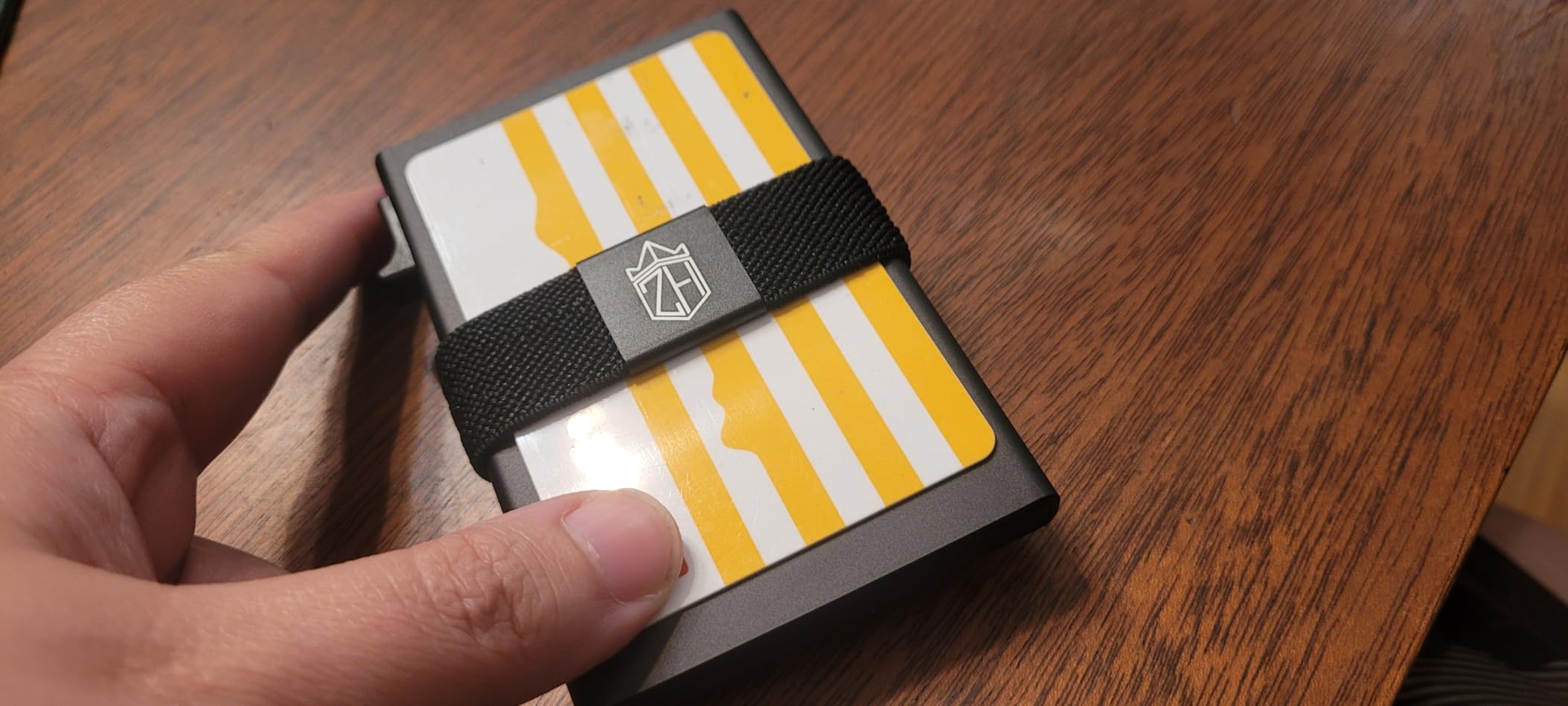 The card-pop trigger on this wallet works as well as most that I've seen and used and I like the ease and consistency that it fans out your cards. Once fanned, you can easily slide them down and slide out card you want. The outer band also allows you to hold more cards, bills, receipts, business cards, etc. The metal finish looks and feels very nice. It seems to rub against itself or me pretty easily, leaving white dust, but this rubs off easily and doesn't leave permanent marks. My only concern is that the metal square on the elastic band is metal with corners. Yes, it looks nice, but it might also scratch my phone screen or things that we set against it. Otherwise a great pop-up wallet with very good looking, functioning, and versatile design