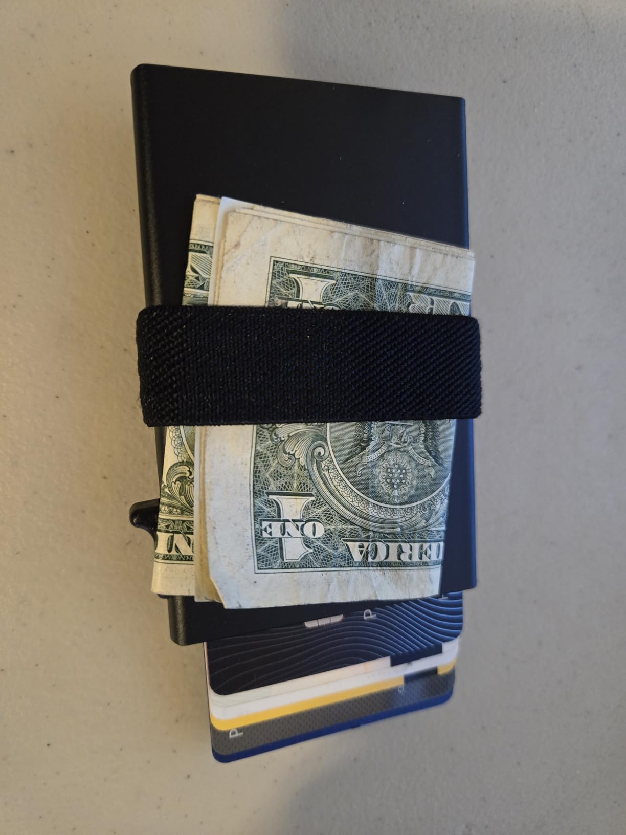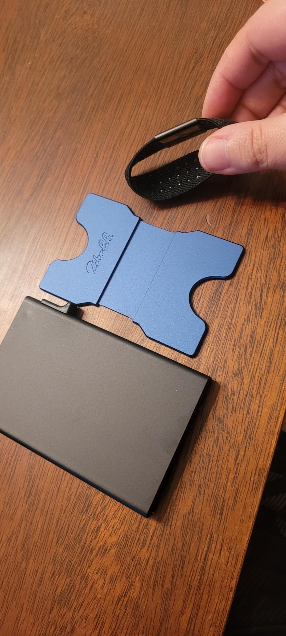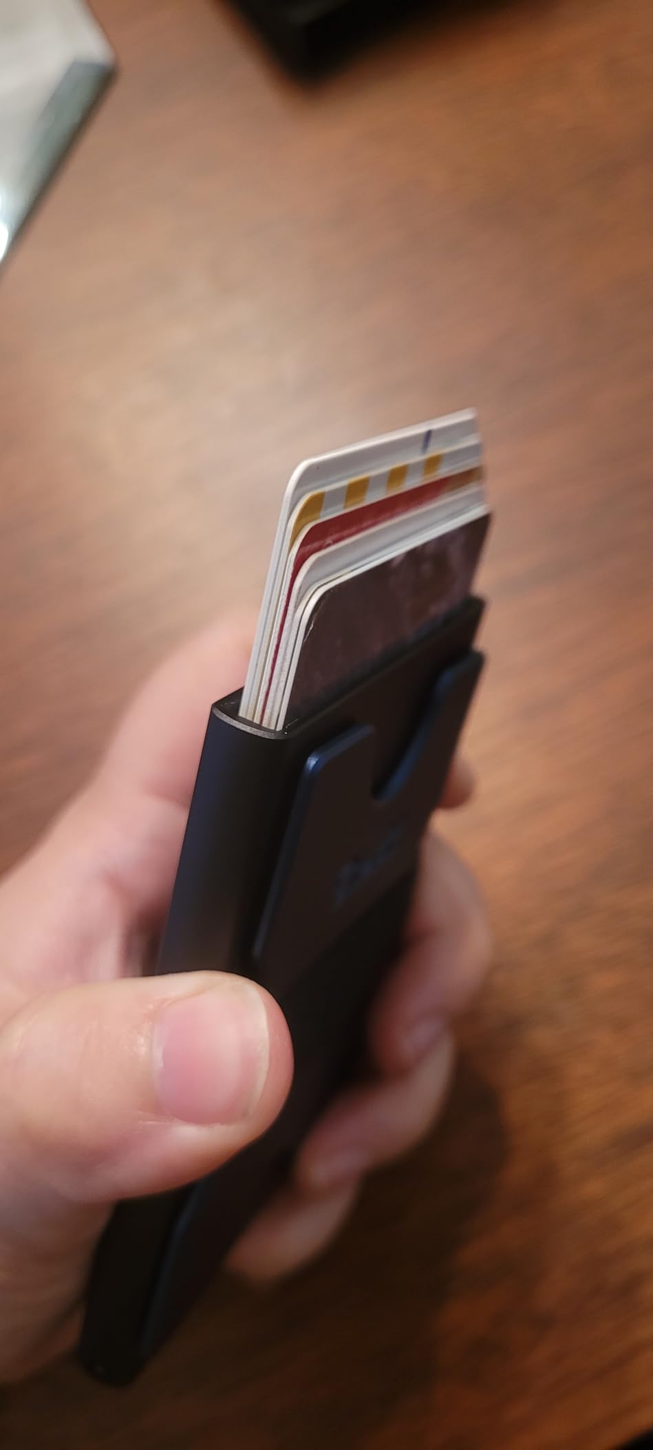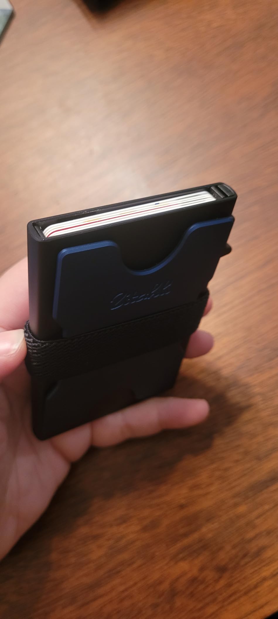 It's a decent slim wallet made of metal. It holds six cards in the main compartment, and they are supposed to be able to slide up using the mechanism on the side. It does indeed pop them up, but not far enough away from each other to allow you to grab one at a time, especially the fifth and sixth cards (at the bottom). The back part (in blue here) is detachable. I am not sure why it is completely separate from the wallet itself, but I fit seven cards back there comfortably. It does get a little slippery, especially pulling it out of your pocket. The cards tend to slide around on each other on that side. The money clip part could actually be used on either side of the wallet, as it's a band with some rubber dots to keep it from sliding around. I did not have cash for the photos, but used a single card to show the idea. The wallet itself feels sturdy, but I do worry about the push-up mechanism, as it feels very flimsy and like it may break. If the body had a slight dip in the top to allow you to retrieve the cards in case the mechanism does break, that would be helpful. Overall, it's a decent slim wallet at an affordable cost that holds six cards in the main compartment, and more on the outside, under the band, or cash if you prefer. I could see this being helpful for traveller's who prefer simple and compact wallets to hold necessary cards.