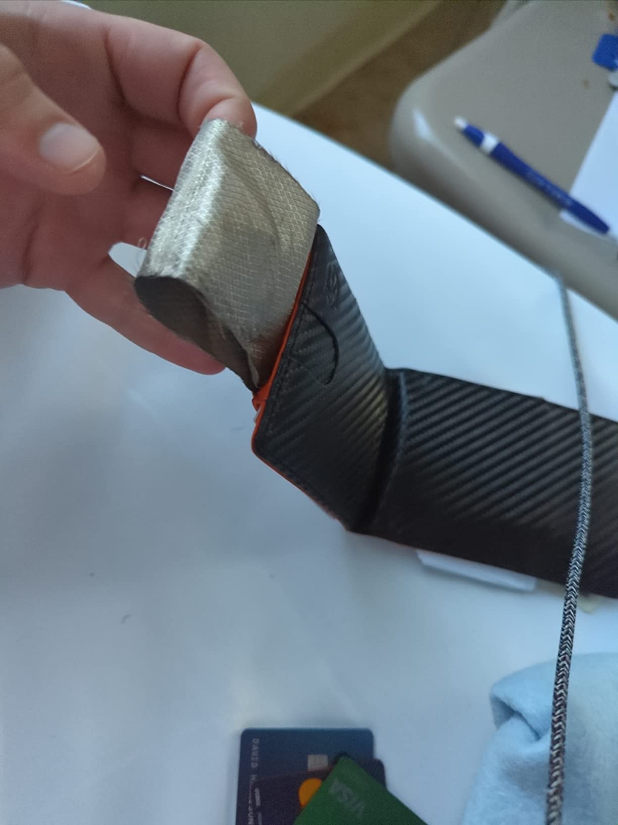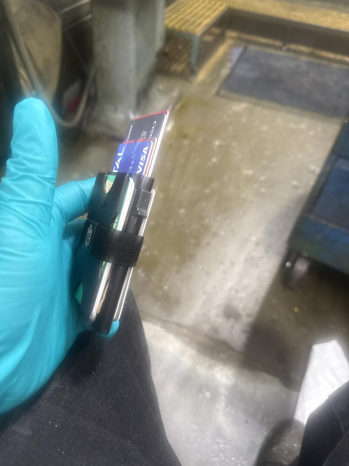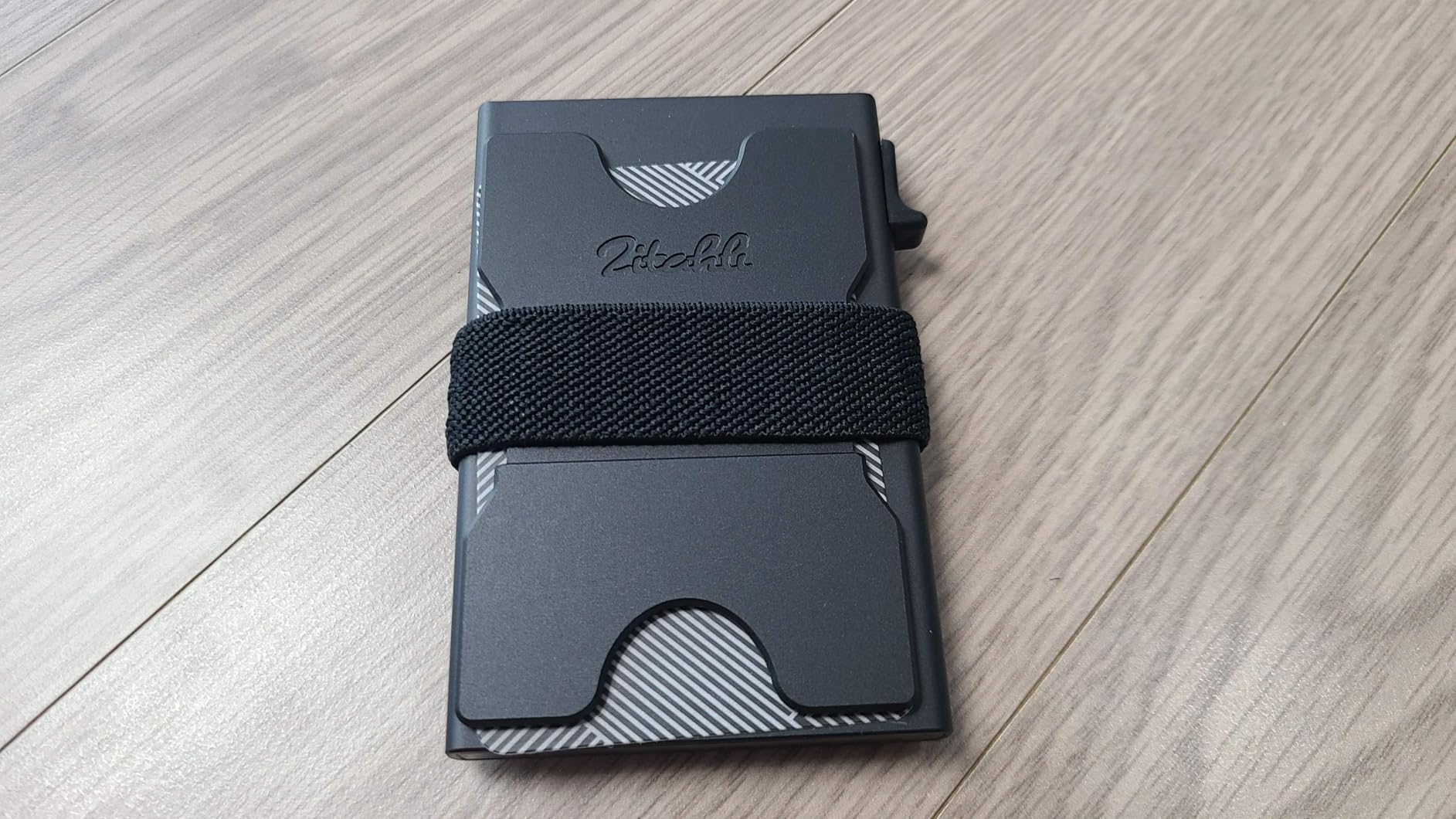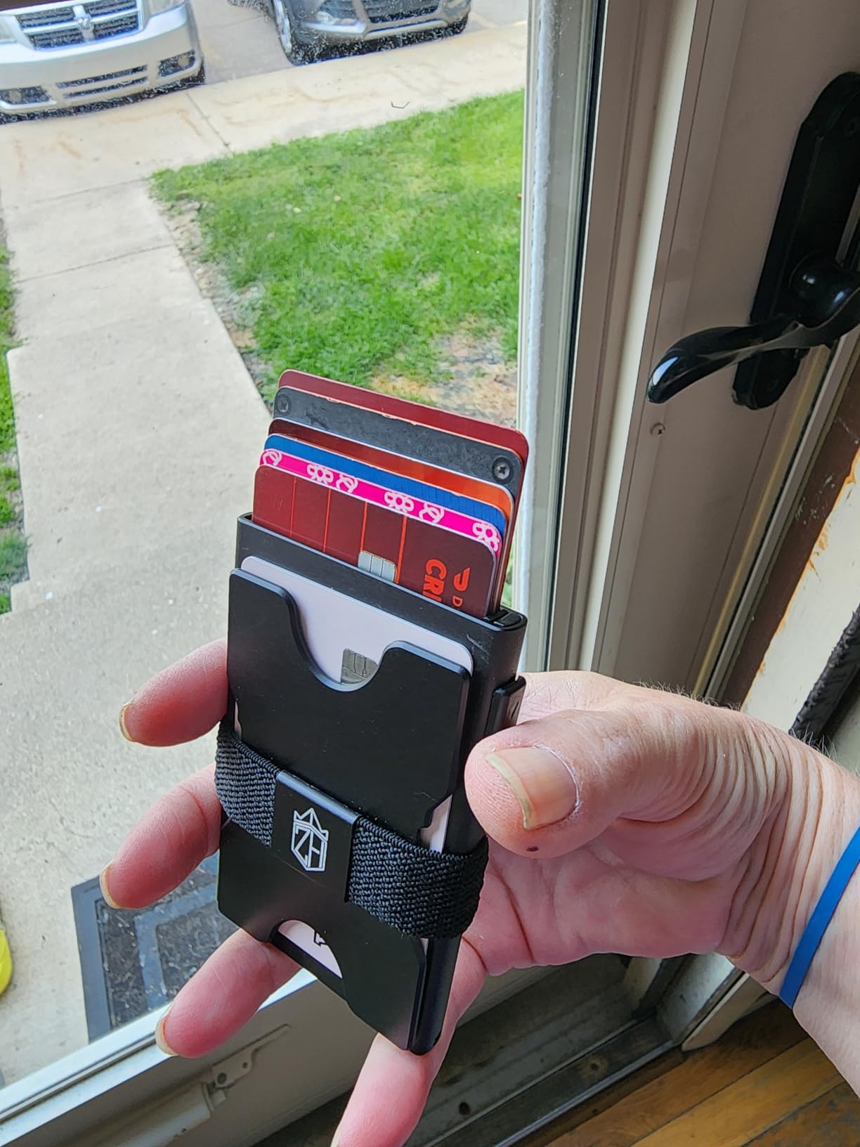 It's a decent slim wallet made of metal. It holds six cards in the main compartment, and they are supposed to be able to slide up using the mechanism on the side. It does indeed pop them up, but not far enough away from each other to allow you to grab one at a time, especially the fifth and sixth cards (at the bottom). The back part (in blue here) is detachable. I am not sure why it is completely separate from the wallet itself, but I fit seven cards back there comfortably. It does get a little slippery, especially pulling it out of your pocket. The cards tend to slide around on each other on that side. The money clip part could actually be used on either side of the wallet, as it's a band with some rubber dots to keep it from sliding around. I did not have cash for the photos, but used a single card to show the idea. The wallet itself feels sturdy, but I do worry about the push-up mechanism, as it feels very flimsy and like it may break. If the body had a slight dip in the top to allow you to retrieve the cards in case the mechanism does break, that would be helpful. Overall, it's a decent slim wallet at an affordable cost that holds six cards in the main compartment, and more on the outside, under the band, or cash if you prefer. I could see this being helpful for traveller's who prefer simple and compact wallets to hold necessary cards.