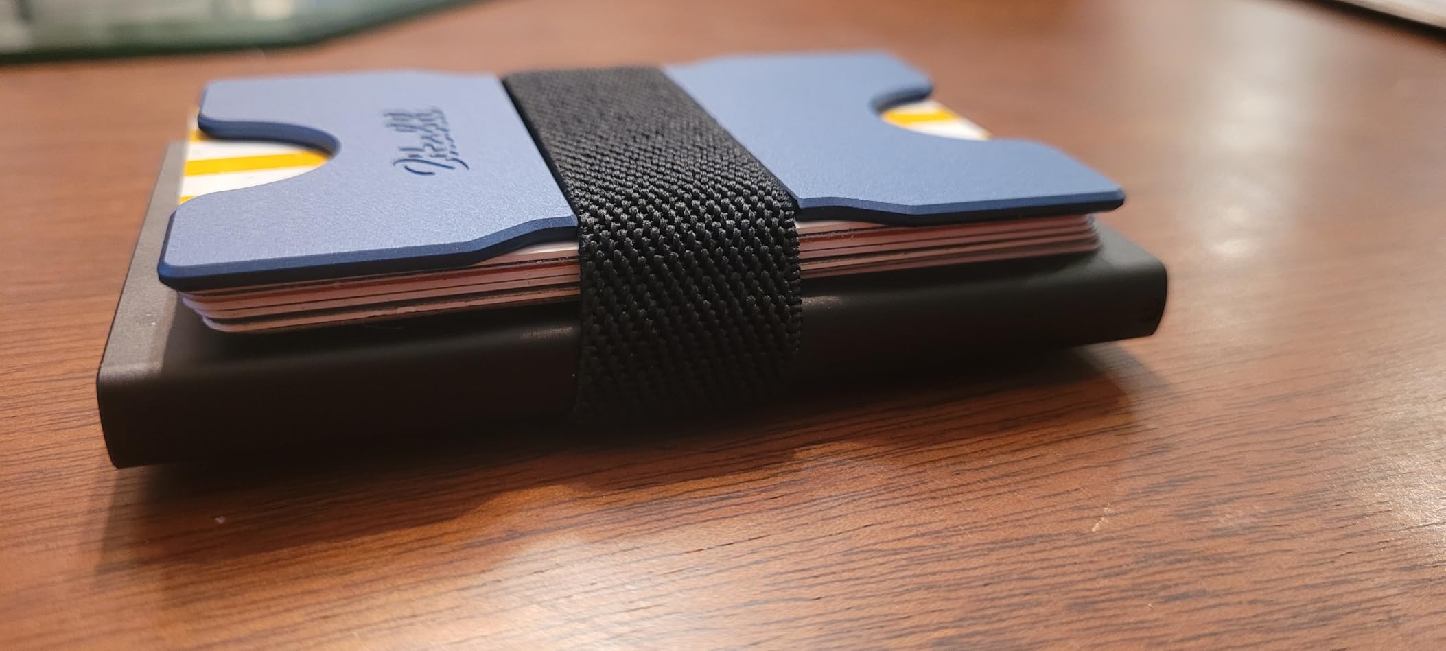 Really slim wallet that holds a decent number of cards, but keeps a slim line. Card stay in the middle really well, unless ejected with the side button. Easy to stash cash in the money clip with the blue plate. Looks and feels stellar. Would make a great gift for dad or teen.
